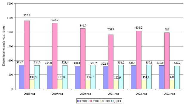 Среди вышеназванных федеральных округов первое место по поголовью оленей занимает УФО, в котором наблюдалось значительное снижение поголовья оленей с 957,3 тыс. голов в 2018 г. до 789 тыс. голов в 2023 г.
