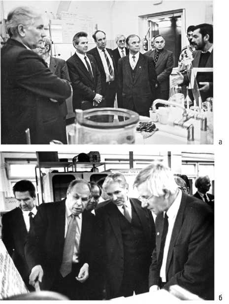 A. V. Kuchin (a) (rightmost) and B. A. Goldin (б) (second from left) acquaint the leaders the Ural Branch RAS with the Laboratory of Solid State Chemistry and Physics (visiting meeting of the Presidium UB RAS, 1992).