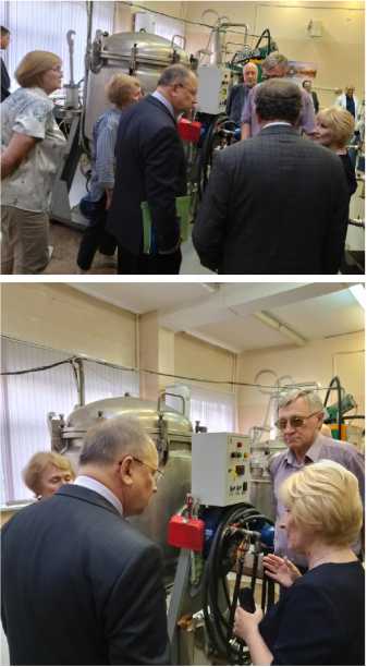 Director of the Institute of Chemistry FRC Komi SC UB RAS, Dr. Sc. (Chem.) S. A. Rubtsova discusses with RAS academicians V. N. Rudenko and V. P. Matvienko innovation prospects at the institute (2022).