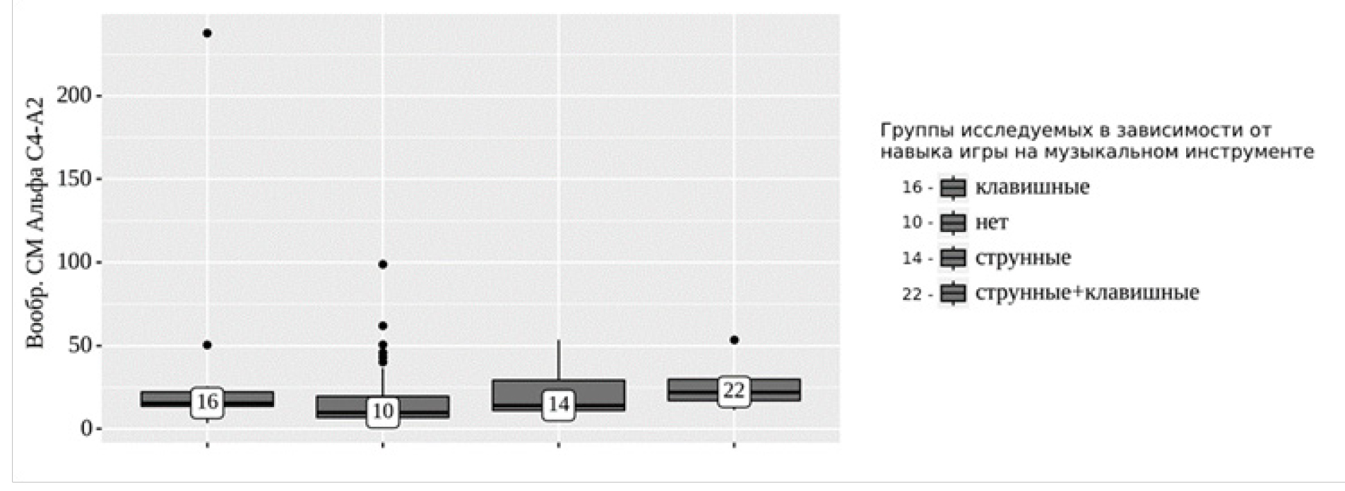 Рис. 1. Анализ спектральных параметров ЭЭГ головного мозга в альфа-диапазоне в отведении C4-A2 в зависимости от наличия навыка игры на музыкальных инструментах у исследуемых лиц. Цифрами здесь и на рис. 2 обозначены показатели медианы (Ме) значений спектральной мощности нейронов по группам исследуемых