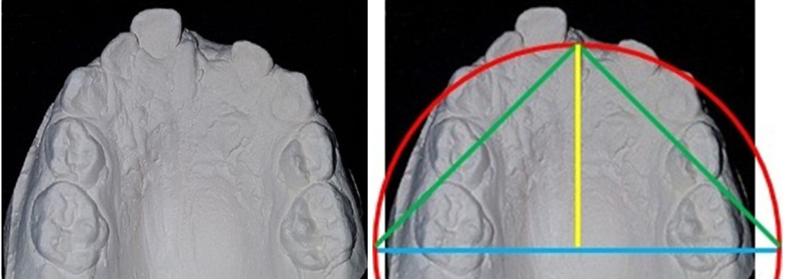 Второй метод основывался на расчете прогнозируемой величины резцово-молярной диагонали. Глубина дуги соответствует половине ее ширины, а эти размеры являются катетами прямоугольного треугольника с углами в 45 градусов, и их размер можно определить как произведение гипотенузы (резцово-молярной диагонали) к синусу угла в 45 градусов (0,707)