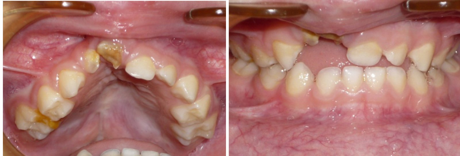 Эффективность предложенных методов графического построения прогнозируемых форм зубных арок определялась при анализе результатов лечения детей с врожденной аномалией в периоде молочного прикуса. С этой целью проведено лечение 15 детей с врожденным односторонним несращением губы и нёба. Практически во всех клинических случаях определялось сужение трансверсальных размеров, более выраженное в переднем сегменте арки. Окклюзия не соответствовала признакам физиологической нормы. Отмечалось укорочение глубины арки (рис. 2).