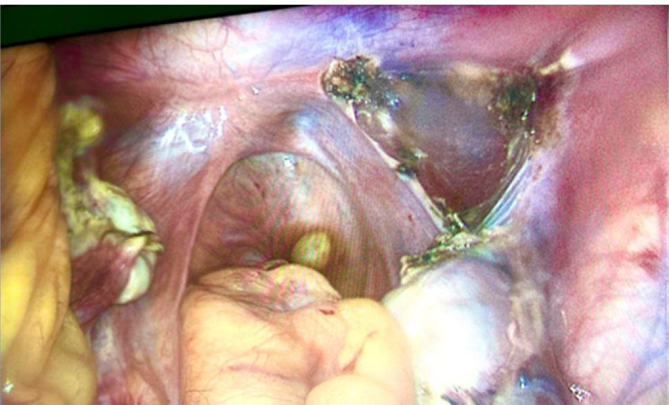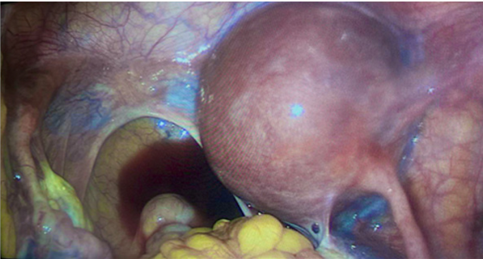 19.04.2019 г. в связи с болевым синдромом на фоне выявленного параовариального образования выполнена диагностическая лапароскопия. Интраоперационно обнаружено: слева маточная труба обычного строения с выраженным фимбриальным аппаратом, яичник 2 × 3 см, обычного строения, с выраженным мозговидным рисунком, расположены на стенке таза, маточная труба отходит от рудиментарной матки, без особенностей. Справа придатки матки расположены по боковой стенке таза: маточная труба обычного строения с выраженным фимбриальным аппаратом, яичник 2 × 3 см, обычного строения, с выраженным мозговидным рисунком, соединены с рудиментарной маткой 2 × 2 см, имеется круглая маточная связка справа. В послеоперационном периоде болевой синдром купировался самостоятельно.