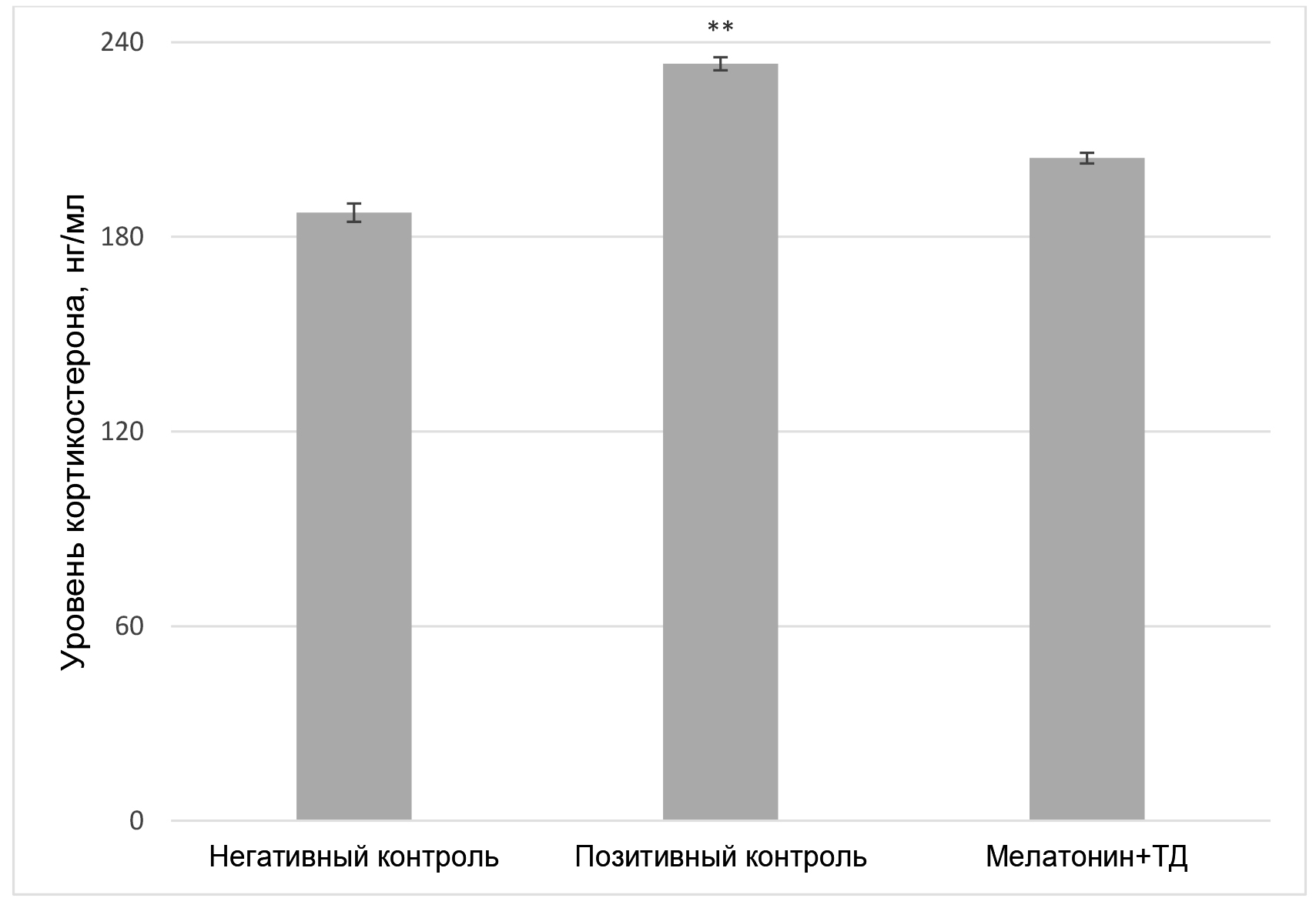 Десинхроноз, вызванный темновой депривацией, является стрессирующим фактором, что подтверждается повышением уровня кортикостерона в сыворотке крови крыс на 24,28 % после 30-дневной темновой депривации. 14-дневный курс введения мелатонина привел к относительному снижению уровня кортикостерона на 12,5 %, что свидетельствует о стабилизации послестрессового состояния организма (рис. 1).