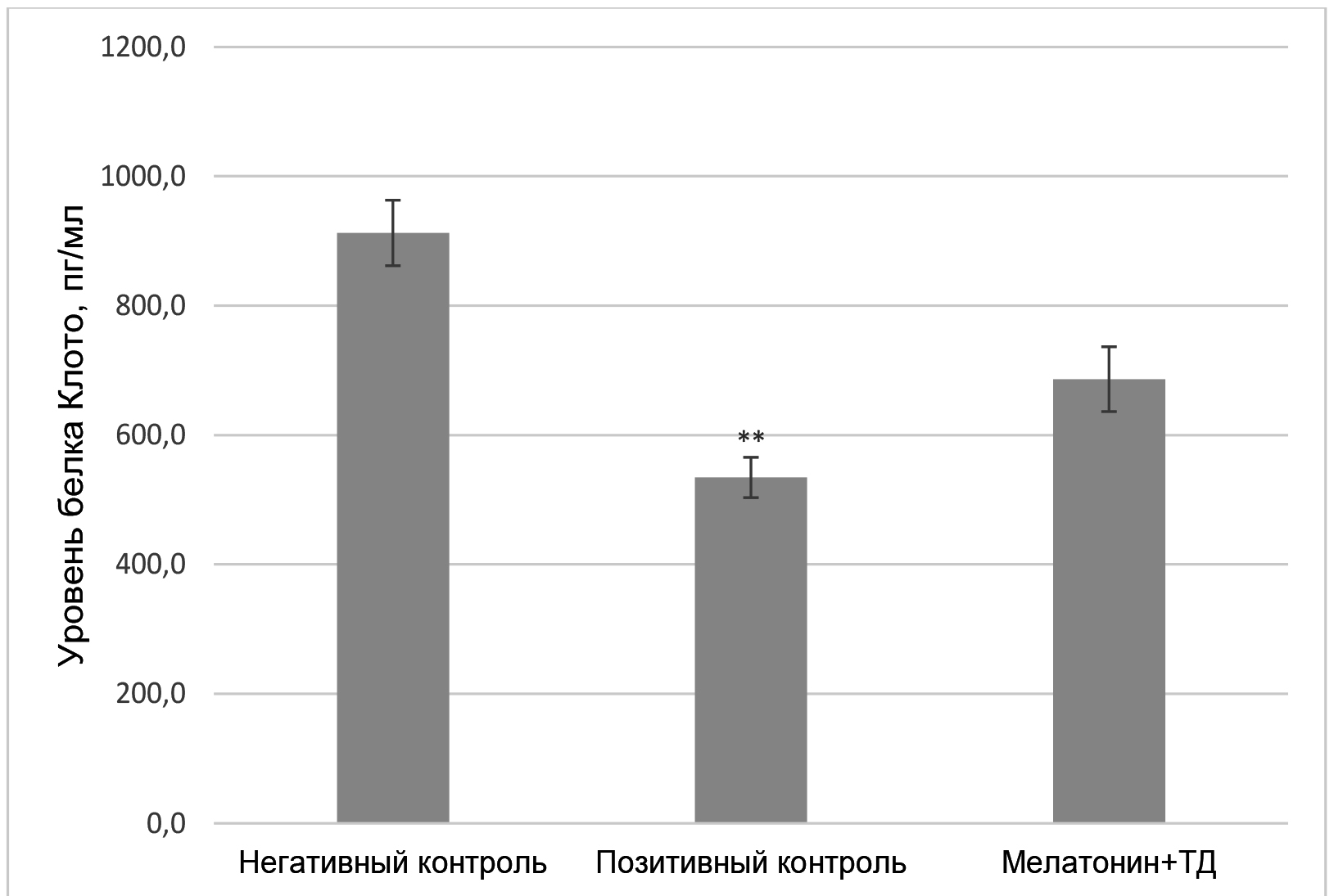 Однако полного восстановления уровня белка Клото в крови у опытных животных, получавших мелатонин, не наблюдалось, значение данного показателя было ниже на 28,4 % по сравнению с таковым у крыс негативного контроля, что было статистически не значимо.