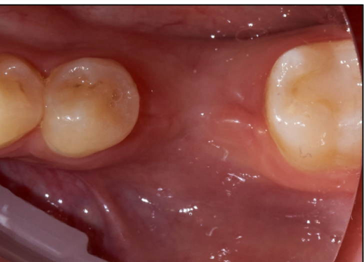 На базе стоматологической поликлиники ВолгГМУ было реализовано оперативное лечение и последующее наблюдение и анализ клинического случая по замещению включенного дефекта зубного ряда с использованием конструкции с опорой на дентальный имплантат. За 4 месяца до планируемой имплантации пациенту М., 25 лет, было произведено атравматичное удаление зуба 3.6, ввиду периапикального деструктивного процесса, потери ферулла твердых тканей маргинальной зоны. В области лунки был помещен коллагеновый матрикс Parasorb, использованы наводящие Z-образные швы Гликолон 5.0. Перед установкой дентального имплантата было визуализировано проявление дефицита и коллапса мягких тканей в участке адентии при удовлетворительных костных условиях для проведения имплантации (рис. 1).