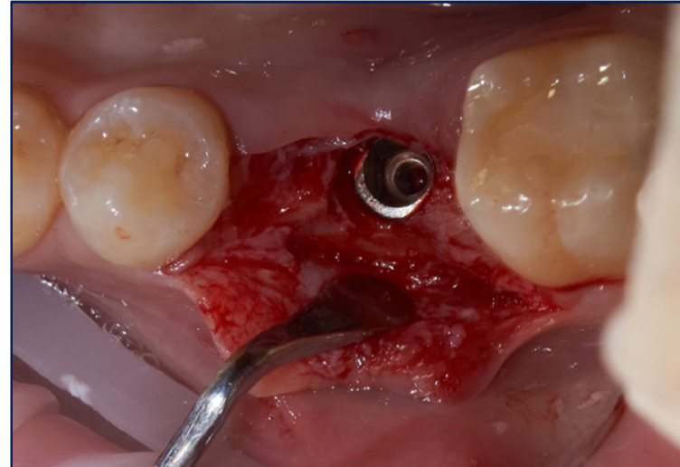 В ходе операции был реализован комбинированный лоскут, с расщепленной частью в апроксимальных и апикальных участках, с целью создания оптимальных условий для кератинизации, реваскуляризации и созревания используемого соединительно-тканного трансплантата. Платформа дентального имплантата (Osstem 4,5/10) спозиционирована субкрестально на 3 мм с целью компенсации вертикального дефицита мягких тканей для формирования биологической ширины (рис. 2).