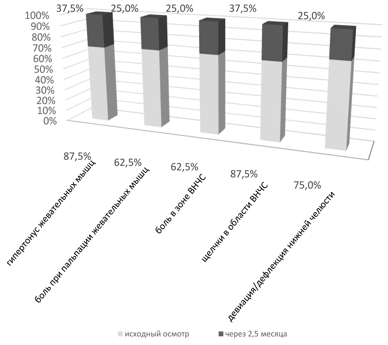У основной группы пациентов с аномалиями прикуса (32 человека) были выявлены: гипертонус жевательных мышц у 90,6 % исследуемых, боль при пальпации жевательных мышц у 59,4 % и зоны ВНЧС у 59,4 %, щелканье в области ВНЧС у 43,75% исследуемых, девиация/дефлекция при открывании рта у 37,5% пациентов. В подгруппе А1 (8 человек) исходный осмотр показал: гипертонус жевательных мышц выявлен у 100 % исследуемых, боль при пальпации жевательных мышц – у 62,5 % и зоны ВНЧС – у 62,5% пациентов, щелканье в области ВНЧС – у 87,5 % исследуемых, девиация/дефлекция при открывании рта – у 75 % пациентов (рис. 1), а в подгруппе Б1 (8 человек): гипертонус жевательных мышц выявлялся у 87,5% исследуемых, боль при пальпации жевательных мышц – у 62,5 % и зоны ВНЧС – у 62,5 % пациентов (рис. 2). При осмотре через 2,5 месяца в подгруппе А1 (8 человек) отмечено: гипертонус жевательных мышц наблюдался лишь у 25 % пациентов, боль при пальпации жевательных мышц – у 12,5 % и боль в зоне ВНЧС – у 12,5 %, щелчки в области ВНЧС – у 25 %, девиация/дефлекция – у 12,5 % исследуемых в этой подгруппе (рис. 1); в то время как в подгруппе Б1 (8 человек) плановый осмотр через 2,5 месяца показал следующие результаты: гипертонус жевательных мышц выявлялся у 12,5 % исследуемых, боль при пальпации жевательных мышц – у 12,5 %; боли при пальпации зоны ВНЧС наблюдались у 25 % пациентов (рис. 2).