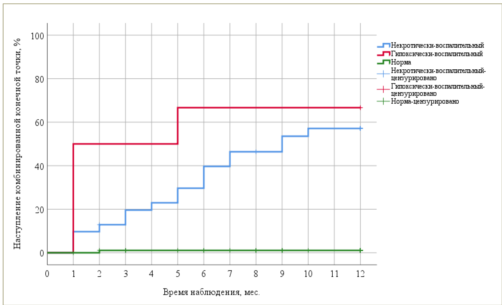 Средний срок достижения ККТ у больных ИМ при некротически-воспалительном типе СЭИ составил (8,1 ± 0,73) месяцев (95%-й ДИ 6,6–9,5 мес.), при гипоксически-воспалительном типе – (5,3 ± 2,0) месяцев (95% -й ДИ 1,4–9,3 мес.), а при отсутствии СЭИ – (11,9 ± 0,11) месяцев (95%-й ДИ 10,1–11,2 мес.). Различия были статистически значимы (p < 0,001). Полученные результаты свидетельствуют о том, что при гипоксически-воспалительном типе СЭИ развития ККТ следует ожидать быстрее, чем при некроти чески-воспалительном.