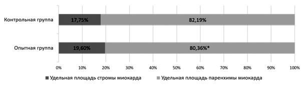 Рис. Удельная площадь соединительной ткани (стромы) и сердечной мышечной ткани (паренхимы) в миокарде левого желудочка контрольной и опытной группы животных