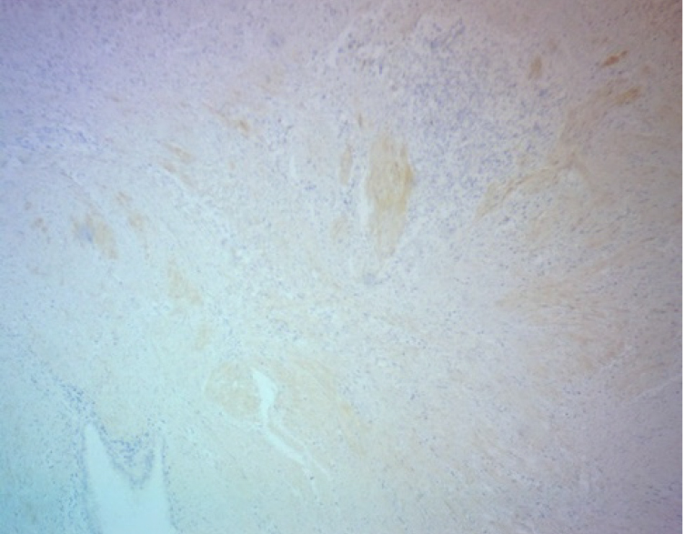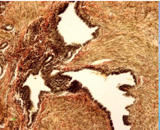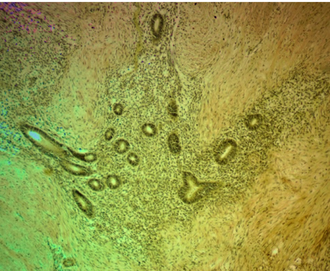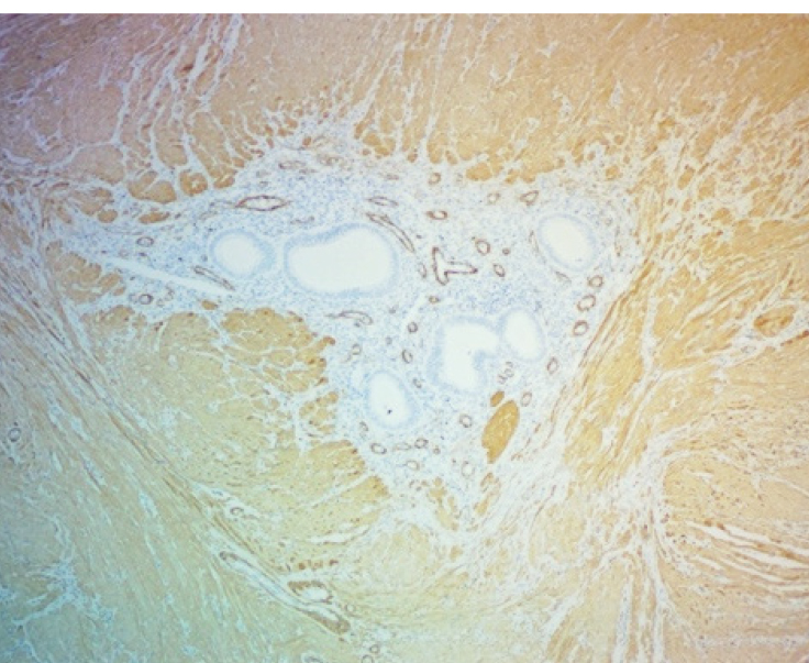 ИГХ-исследование выявило положительную экспрессию гладкомышечного актина в фокусах фиброза вокруг и между очагами экстрагенитального эндометриоза. Гладкомышечный актин экспрессировался в миофибробластах, концентрически расположенных вокруг эндометриоидных гетеротопий по типу «муфт» (рис. 3).