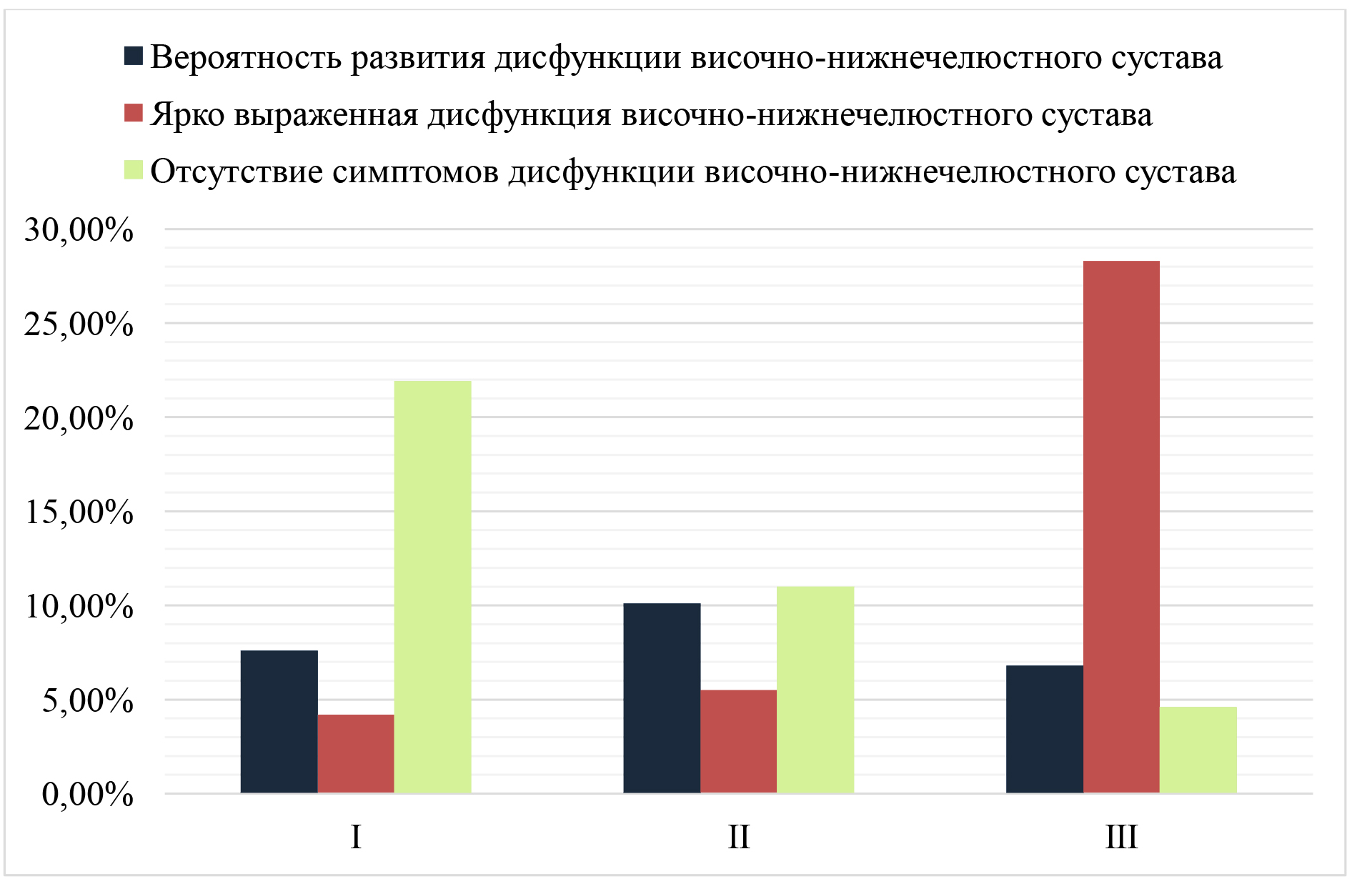 После выявления патологий височно-нижнечелюстного сустава оценка дисфункции производилась согласно результатам «Гамбургского теста», который позволяет достаточно точно и быстро дать оценку функциональному состоянию височно-нижнечелюстного сустава на основе сбора анамнеза и оценки следующих критериев: асимметричность открывания рта, наличие ограничения открывания рта, наличие внутрисуставных шумов, окклюзионный звук, болезненность при пальпации жевательных мышц, травматичность эксцентрической окклюзии зубов. На основе результатов теста согласно критериям оценки «Гамбургсккого теста» было выделено три группы: пациенты с ярко выраженной дисфункцией височно-нижнечелюстного сустава, пациенты с высокой вероятностью развития дисфункции височно-нижнечелюстного сустава и пациенты без видимых клинических признаков данной патологии (функциональная норма).