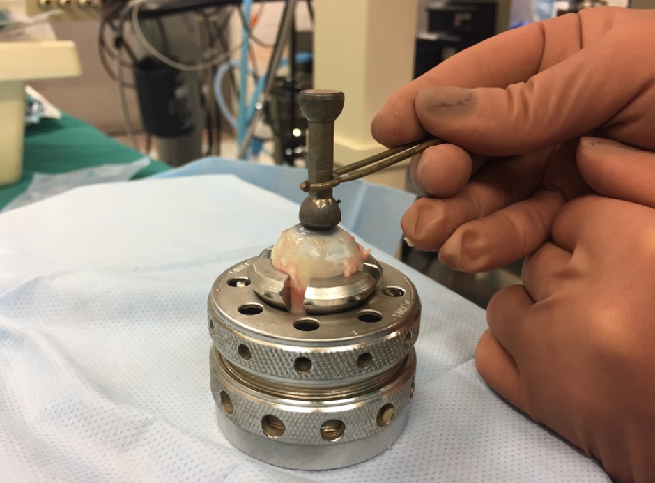 Объектами экспериментального исследования стали 6 изолированных донорских (кадаверных) глаз, не прошедший качественный отбор материала для проведения кератопластики. Кадаверные глаза были предоставлены Глазным тканевым банком федерального государственного автономного учреждения «Национальный медицинский исследовательский центр «Межотраслевой научно-технический комплекс «Микрохирургия глаза» имени академика С.Н. Федорова» Министерства здравоохранения Российской Федерации, г. Москва, имеющим лицензию на осуществление медицинской деятельности по изъятию и хранению органов и (или) тканей человека для трансплантации; транспортировку органов и (или) тканей человека для трансплантации. Каждый экспериментальный глаз с целью фиксации помещали в специальную подставку-держатель (Экспериментально-техническое производство «Микрохирургия глаза», Россия, Москва), которая путем вращения винта-фиксатора регулирует степень давления на глазное яблоко, и тем самым создается стабильное внутриглазное давление [2]. Как известно из литературы, значение внутриглазного давления влияет на полученный размер (диаметр) сформированного ложа роговицы реципиента, а также размер диска донорского трансплантата [3]. В связи с этим для более точного формирования роговичных срезов параметр внутриглазного давления в каждом случае контролировался с помощью аппланационной тонометрии по Маклакову грузами в 10 грамм и составил (17,0 ± 3,0) мм рт. ст. (рис. 1).