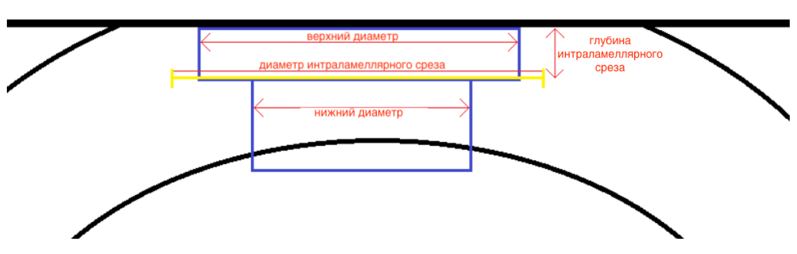 Для избегания чрезмерного давления ИСК на роговичную ткань в сформированном кольцевом интрастромальном тоннеле его диаметр задается больше диаметра ИСК на 0,4 мм. Благодаря наличию этого тоннеля интрастромальное кольцо помещали на точно заданную глубину. Оно остается отдалено от интерфейса донор – реципиент, тем самым минимизируется его влияние на формирование полноценного рубца роговицы, его плотность и стабильность в послеоперационном периоде. Пример параметров образования роговичных резов на фемтосекундном лазере представлены в таблице.