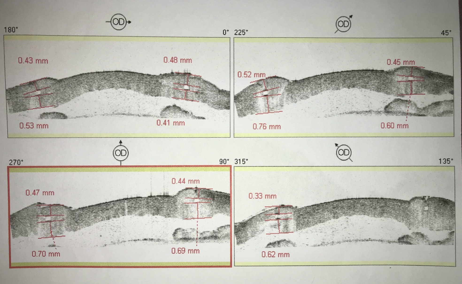 Рис. 5. Положение интрастрамального кольца в 4 меридианах в строме роговицы кадаверного глаза по данным оптической когерентной томографии