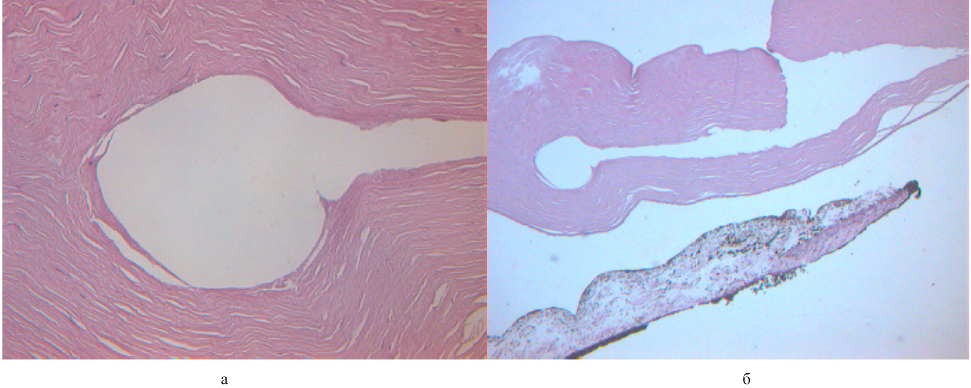 С целью оценки возможного деструктивного влияния лазерного воздействия на окружающую ткань при используемых настройках ФСЛ провели гистологическое исследование краев роговичных резов [3]. Для выполнения исследования опытный материал фиксировали в растворе нейтрального формалина, далее промывали проточной водой, обезвоживали в спиртах восходящей концентрации, после чего снова заливали формалином. Выполняли гистологические срезы, окрашенные гематоксилин-эозином, полученные препараты изучали под световым микроскопом фирмы Leica DM LB2 (Leica, Германия) при 50, 100, 200, 400-кратном увеличении с последующим фотографированием (рис. 7). На полученных образцах определялся максимально ровный отвесной край роговичного реза, окружающая ткань была без признаков повреждения, сформированный ламеллярный тоннель имел четкую форму без разволокнения стромы (рис. 7 а, б).