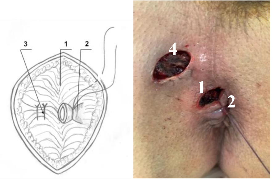 Рис. 6. Модифицированная операция LIFT: 1 – межсфинктерное пространство; 2 – проксимальная культя свищевого хода; 3 – ушитый дефект наружного анального жома после иссечения дистальной части фистулы; 4 – дистальная часть свищевого хода иссечена