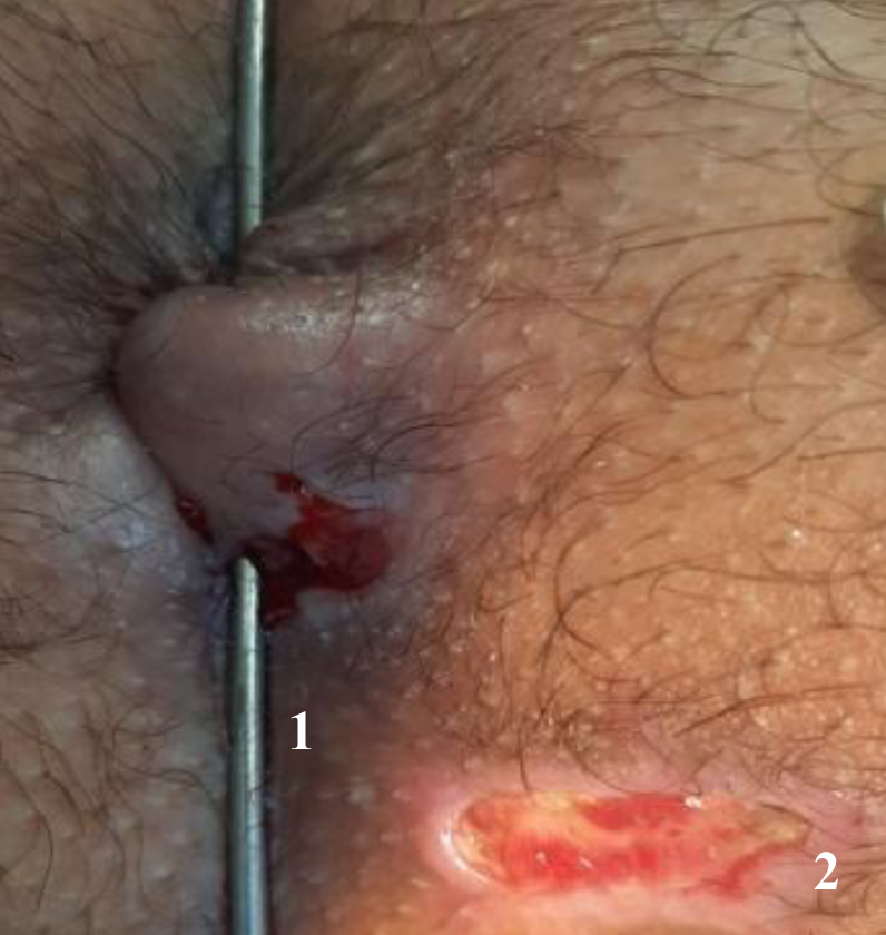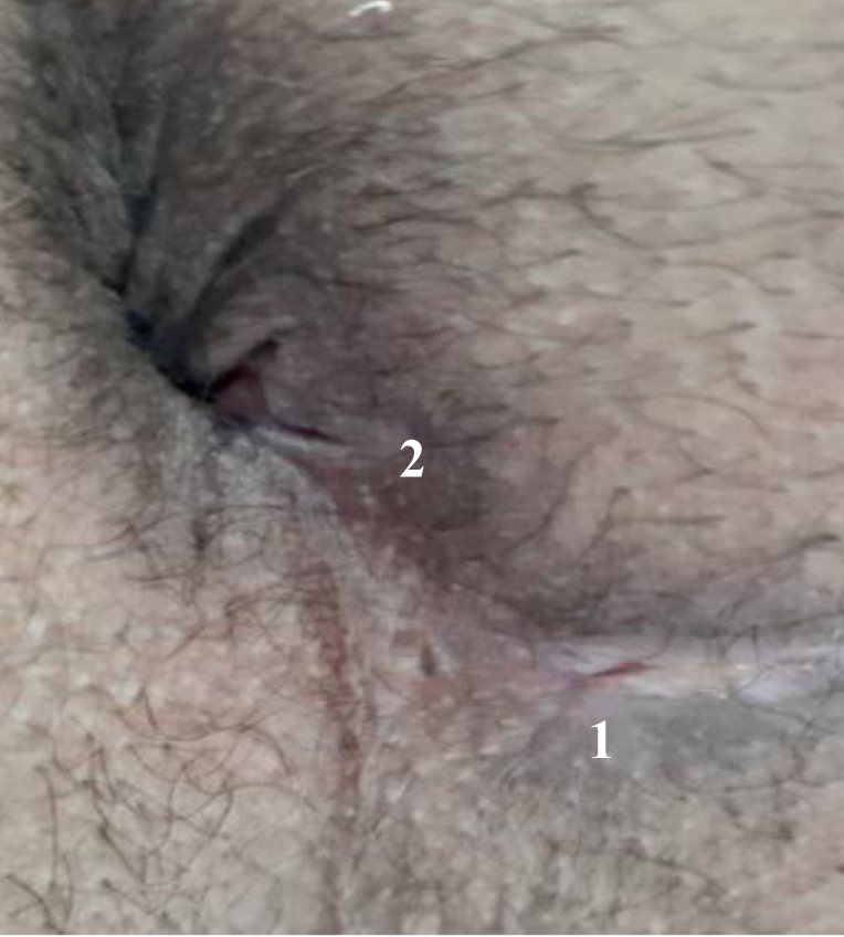 Рис. 9. Состояние после модифицированной операции LIFT (30-е сутки) и после операции рассечения интрасфинктерного свища в просвет кишки (9-е сутки): 1 – рубец после иссечения дистальной части свищевого хода при операции LIFT; 2 – эпителизирующая рана второго этапа (рассечение интрасфинктерного свища в просвет кишки)