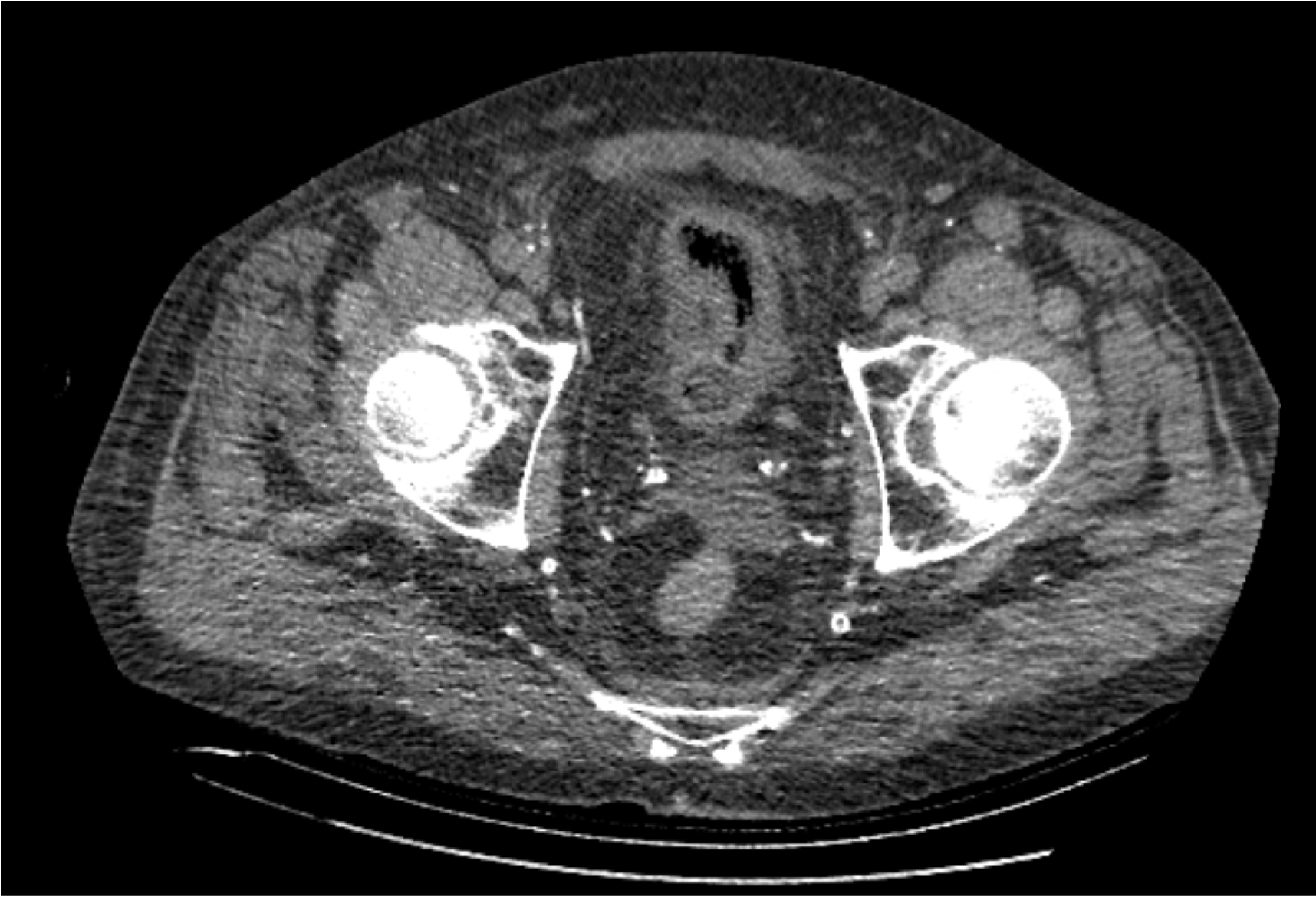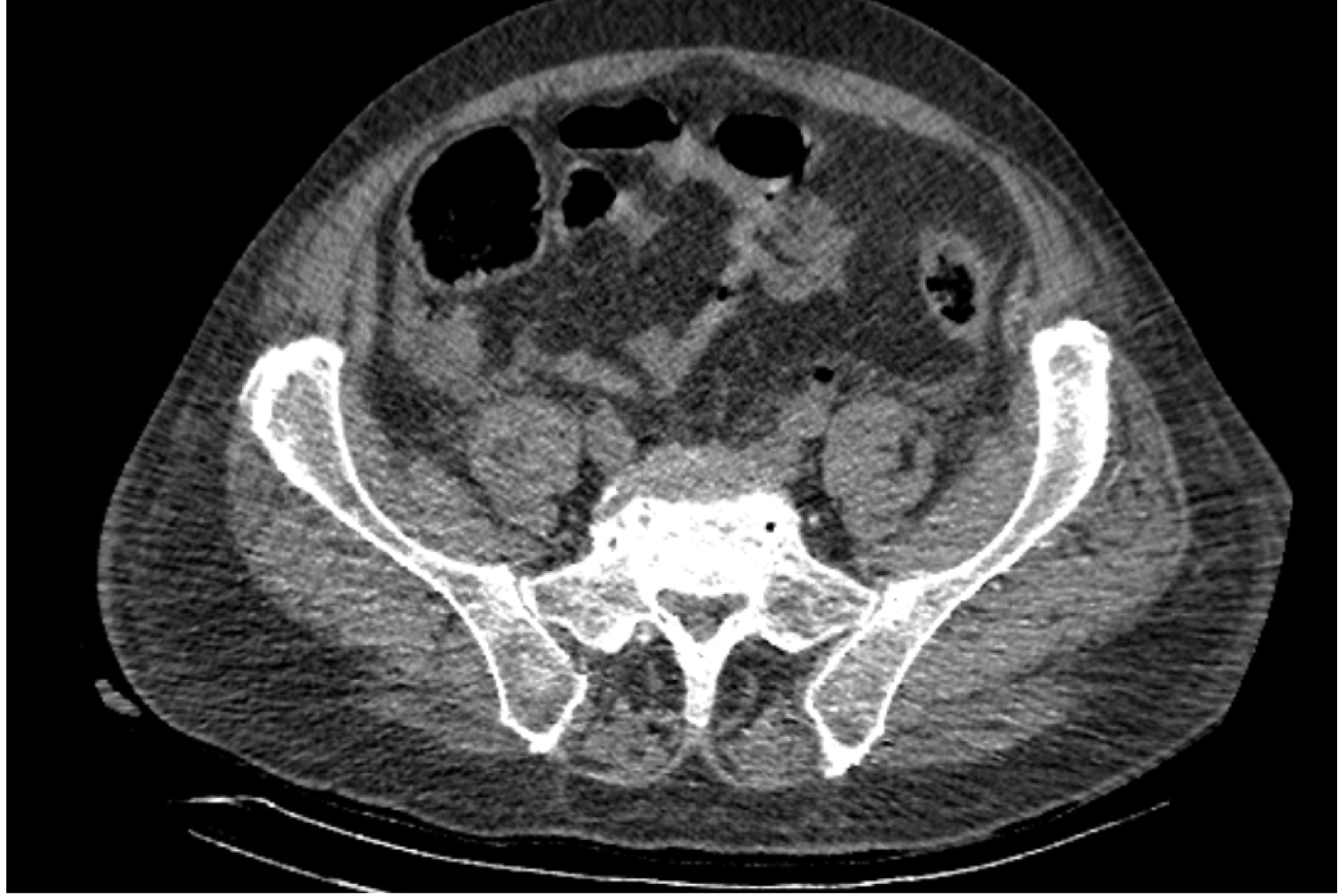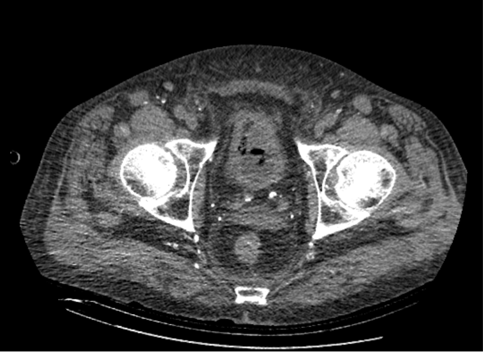 Рис. 1. Компьютерная томография органов брюшной полости, забрюшинного пространства, органов малого таза. Газ в мочевом пузыре