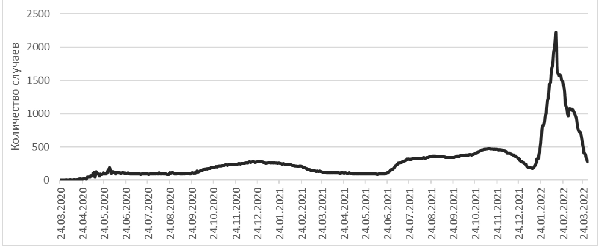 Рис. 2. Динамика случаев заражения коронавирусом в Волгоградской области (с 24.03.2020 г. по 30.03.2022 г.)