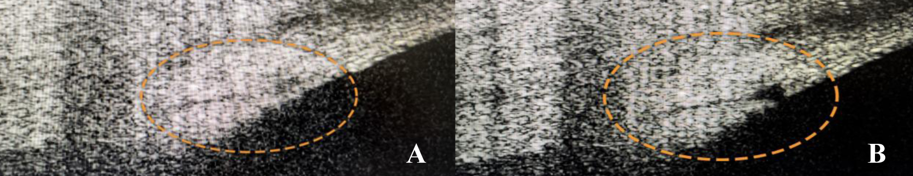 Рис. 1. ОКТ трабекулы и коллекторного канальца до (А) и после (B) комбинированной технологии YAG-лазерной трабекулостомии