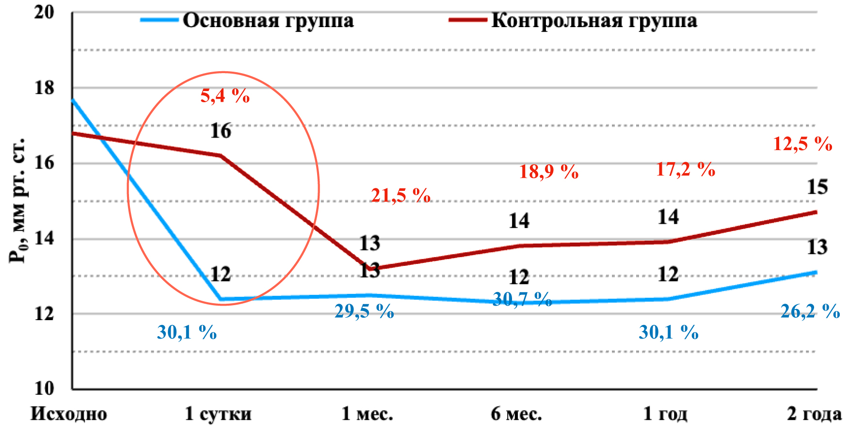 Рис. 2. Динамика изменения ВГД (P0) в основной (оптимизированная YAG-лазерная трабекулостомия) и 2-й контрольной (СЛТ) группах