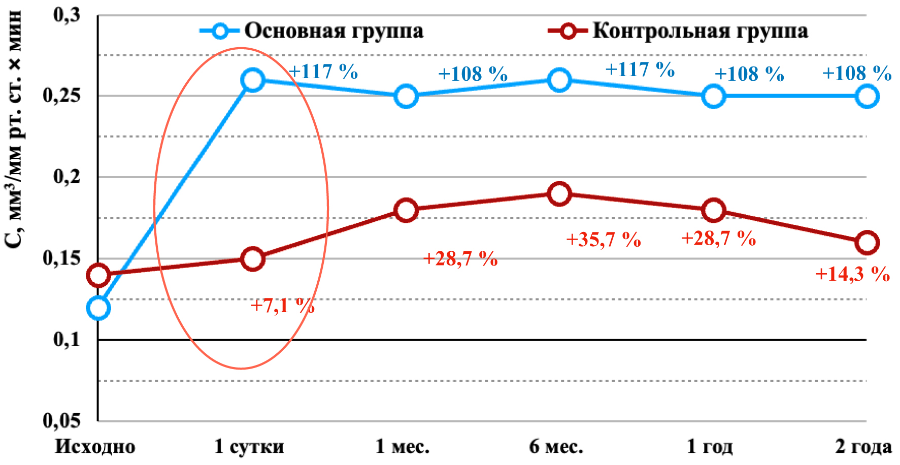 Коэффициент легкости оттока внутриглазной жидкости у основной группы после YAG-лазерной трабекулостомии увеличился на 117 % на следующие сутки после операции и, в отличие от контрольной группы, был значительно выше, сохраняясь в течение года.