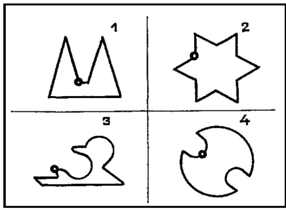 Второй этап заключался в изучении пространственной координации движений рук. Измерение проводили с помощью метода суппортометрии, на установке, представляющей собой модифицированный суппорт. Перед началом исследования подопытные получали стандартную инструкцию. Предполагалось выполнить последовательно четыре задания, по мере их усложнения (рис. 1). Во время выполнения задания регистрировали следующие показатели: время пребывание маркера на контуре задания (ВНК), время пребывания маркера вне контура задания (ВВК), общее время выполнения задания (ОВ), количество ошибок при выполнении задания (КО), скорость выполнения задания (СК) и интегральный показатель координации (ИПК) [7].
