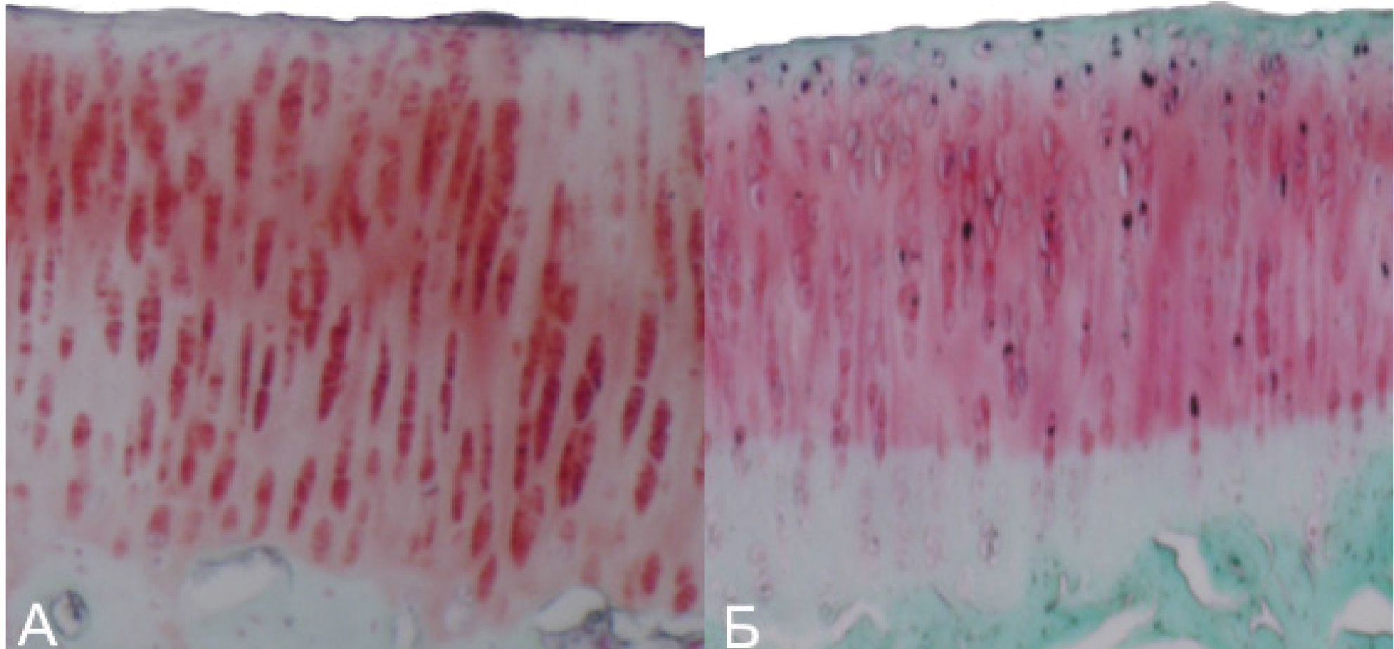 Рис. 1. Суставной хрящ: А – интактное состояние; Б – через три недели после внутрисуставного введения САБС. Окрашивание сафранином О, ×40