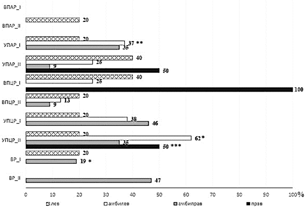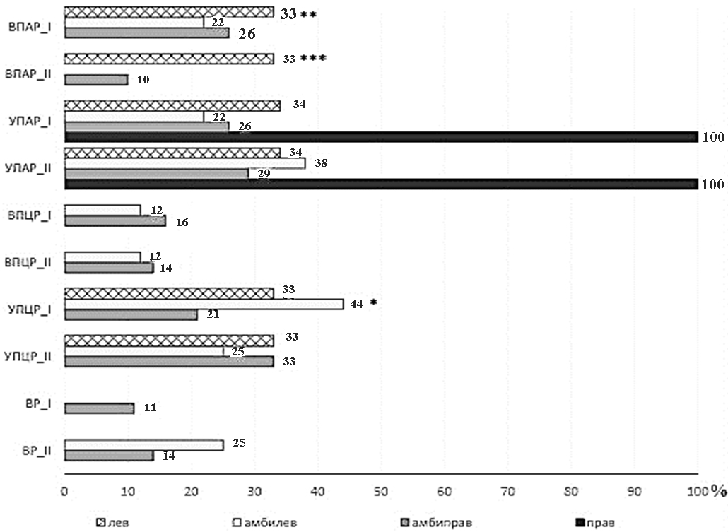 При этом после перехода в вертикальное положение существенно увеличивалось число женщин-амибидекстров с ВР (p = 0,025). УПЦР было выявлено у наибольшего числа женщин-амбидекстров с правым латеральным фенотипом, АпрЛФ (р = 0,039).