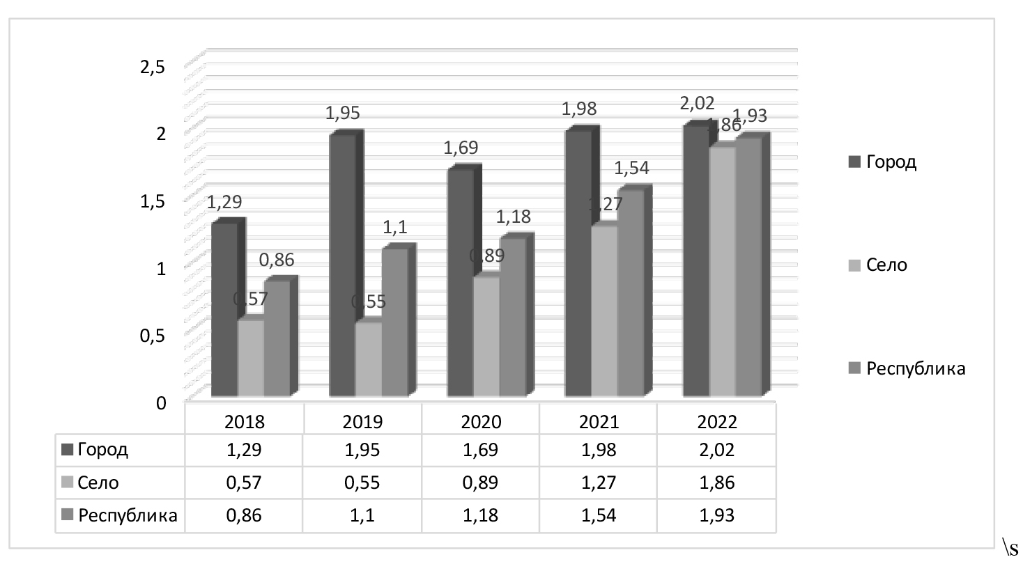По данным на 2018 г. в предгорной местности показатель составлял 0,41 на 1 000 населения, а в 2022 г. он увеличился до 2,1 (увеличение в 5,1 раза). Почти такая же картина наблюдалась в равнинной климатической зоне. В 2018 г. показатель был равен 0,69, а в 2022 г. – 2,2 (увеличился в 3,2 раза).