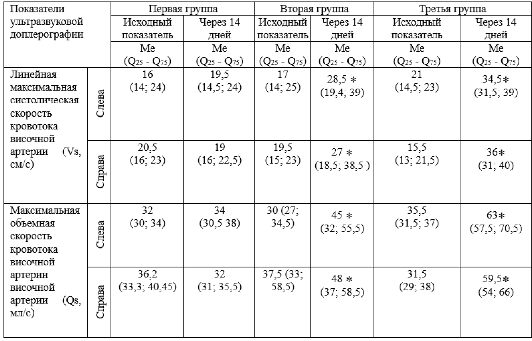 * Различие статистически достоверно (р ≤ 0,05) при внутригрупповом сравнении с исходными данными. Рис. Результаты ультразвуковой допплерографии поверхностных височных артерий на этапах исследования