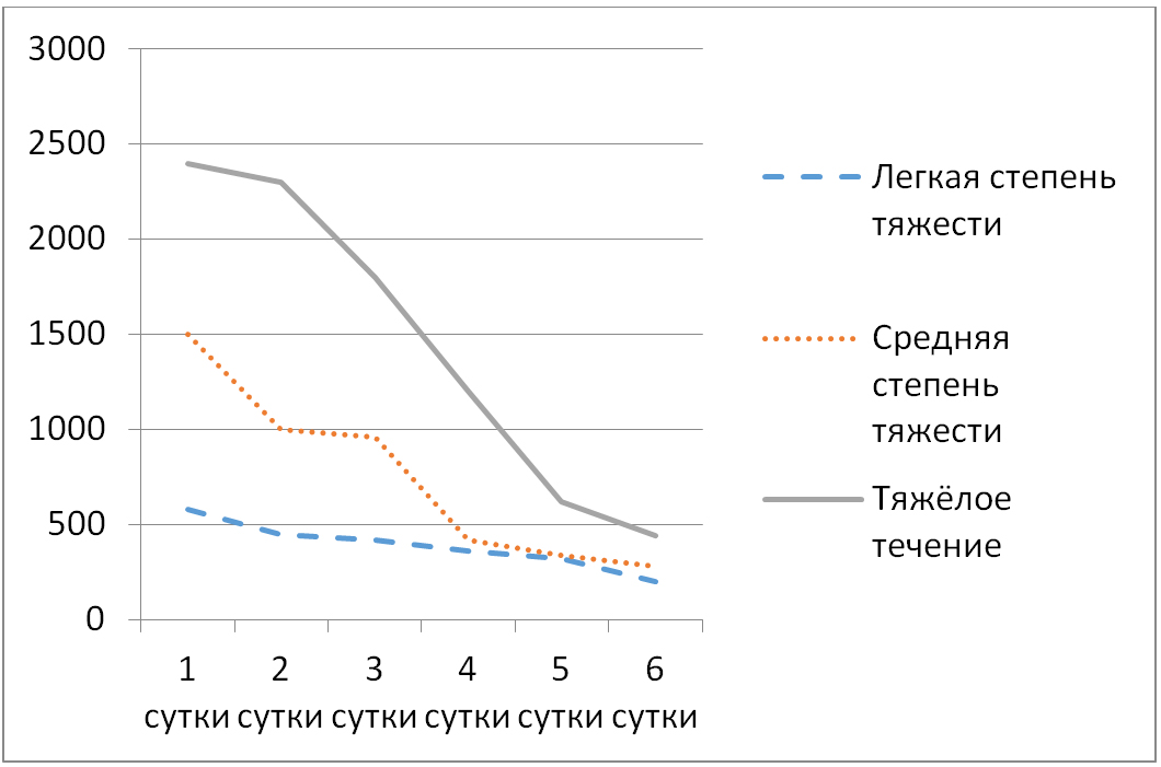Снижение уровня фермента при легком течении БОП происходило плавно, без резких скачков. При средней тяжести течении БОП уровень альфа-амилазы желчи изначально в среднем составлял (1467,00 ± 143,14) Ед/л (Ме = 1400 Ед/л). Снижение уровня фермента чаще всего (по данным средних показателей посуточного мониторинга) происходило ступенчато со значимыми перепадами на 2-е и 4-е сутки после операции. При тяжелом течении БОП уровень альфа-амилазы желчи изначально в среднем составлял (1880,00 ± 230,43) Ед/л (Ме = 1725 Ед/л). Различия уровня альфа-амилазы желчи статистически значимы между легким и тяжелым течением БОП (p = 0,000011) и не значимы между средней тяжестью и тяжелым течением БОП (p = 0,146275). При тяжелом течении БОП, как и при средней тяжести заболевания, снижение показателей альфа-амилазы происходило ступенчато, с существенными перепадами на 2-е и 5-е сутки после операции. В эти периоды перепадов уровень альфа-амилазы в желчи снижался в среднем на сутки ранее, чем в крови.