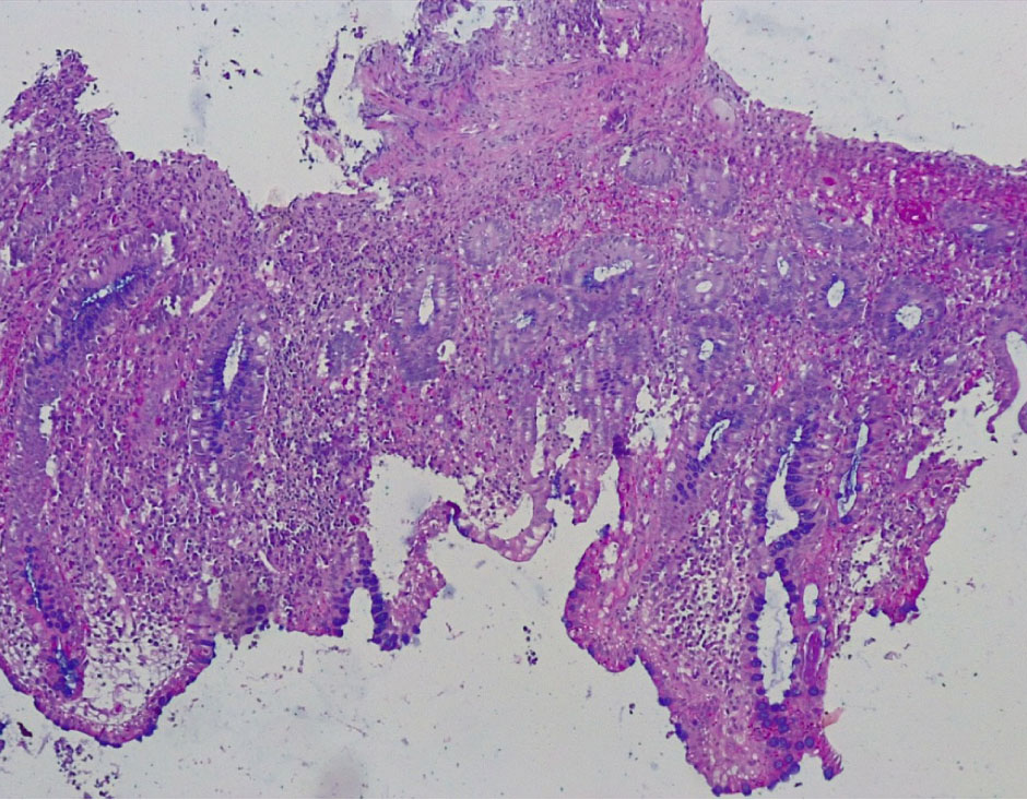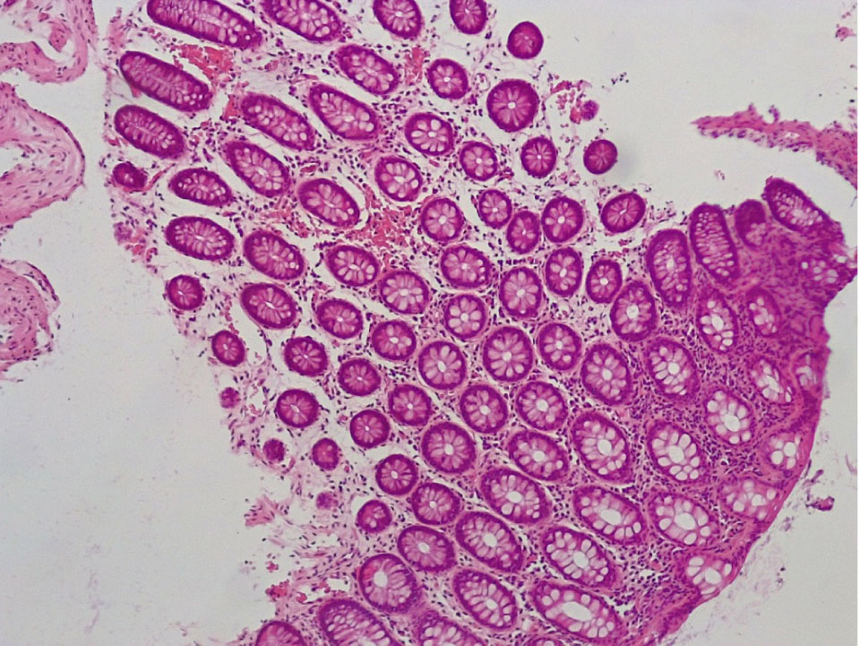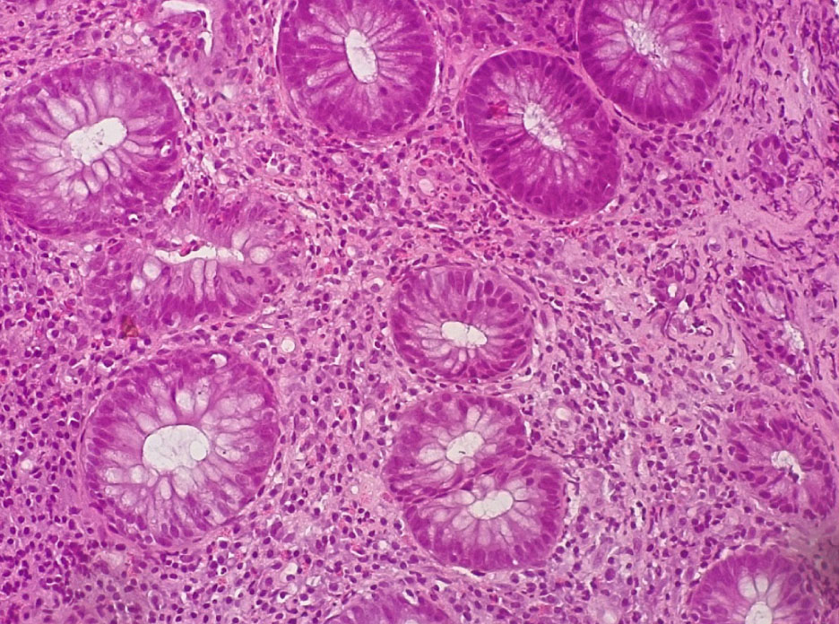 Неспецифический язвенный колит (НЯК) представляет собой хроническое рецидивирующее прогрессирующее воспалительное заболевание слизистой оболочки преимущественно дистальных отделов толстого кишечника (прямая, сигмовидная кишка). Однако этиология и патогенез НЯК остаются до конца не изученными. Характерными морфологическими признаками НЯК являются неглубокие язвенные дефекты слизистой оболочки, достигающие собственную и мышечную пластинки, с окружающей различной степени выраженности воспалительной инфильтрацией за счет лимфоцитов, плазмоцитов, нейтрофилов, формирование гнойного криптита и крипт-абсцессов [1, 2, 3].