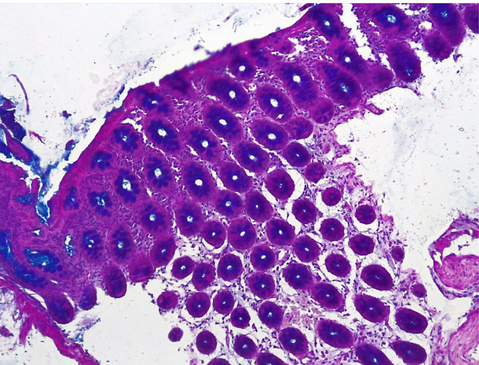 Рис. 5. Основная группа: снижение секреции муцина цилиндрическим эпителием СО толстой кишки, атрофия бокаловидных клеток и небольшое количество альциан + слизи в криптах. ШИК-реакция с докраской альциановым синим, ×200