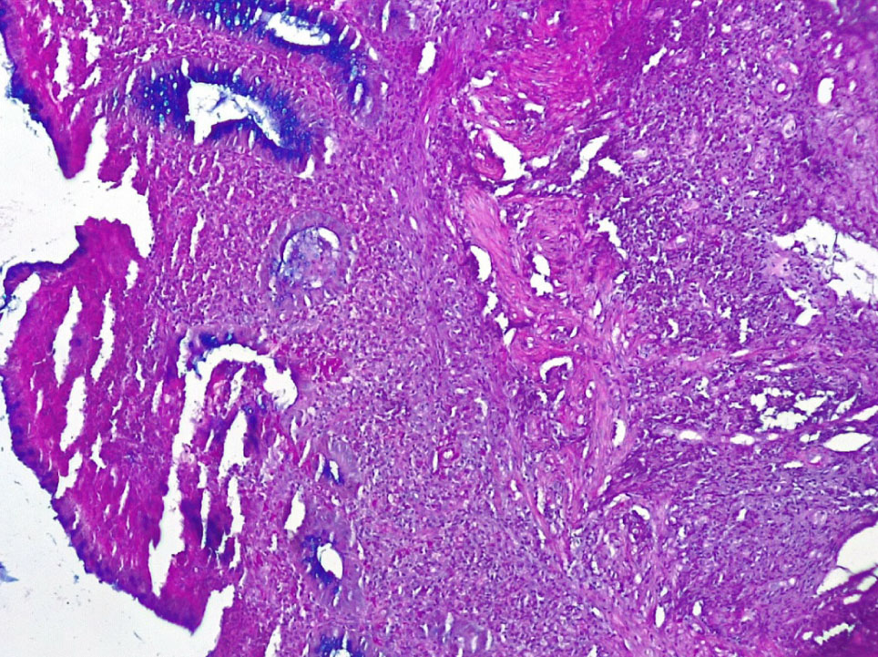 В отдельных участках СО при НЯК встречались единичные крипты, содержащие отдельные бокаловидные клетки и альциан + гликопротеиды (нейтральные мукополисахариды), резко выраженное хроническое воспаление стромы с развитием рыхлой волокнистой соединительной ткани (фиброза) (+++ степень атрофии и фиброза) (рис. 6).