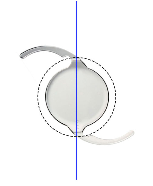 Рис. 1. Модель ИОЛ Tecnis, прямая линия – ось цилиндра ТИОЛ, соответствующая оси шовной фиксации, пунктиром обозначена оптимальная дистанция для шовной фиксации