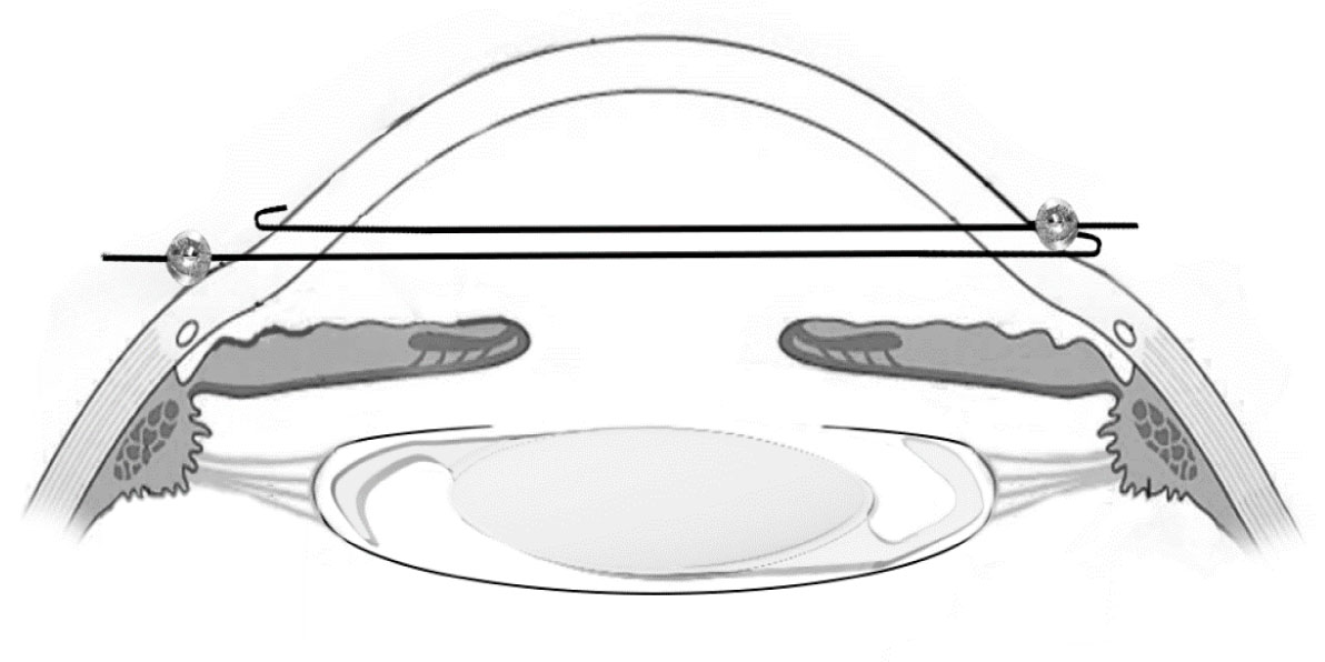Для выполнения предлагаемого способа шовной фиксации ТИОЛ к радужке необходимо выполнить стандартную разметку на лимбе оси цилиндра ТИОЛ и два парацентеза 1,2 мм в проекции данных меток в плоскости параллельной радужке. ТИОЛ позиционируют в правильной плоскости и центрируют. Затем через оба парацентеза навстречу друг другу проводят два ирис-ретрактора так, чтобы каждый ретрактор фиксировался снаружи за роговицу в области одного парацентеза крючком на его конце, а в противоположном парацентезе – муфтой ретрактора (рис. 2).