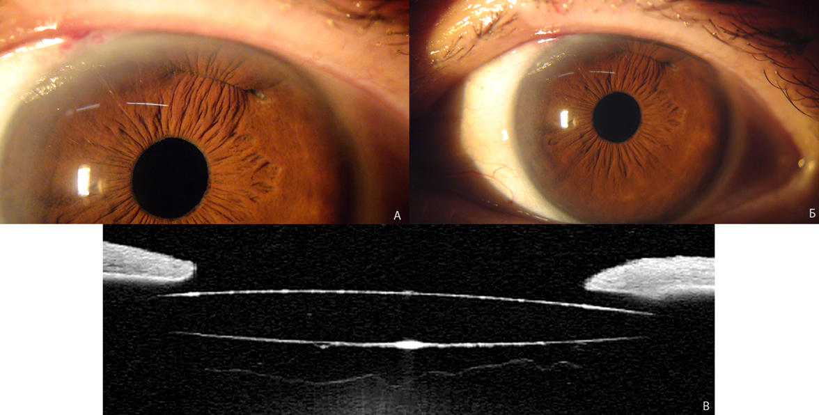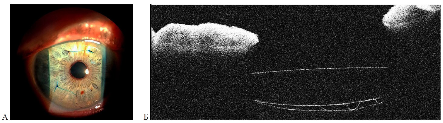 Рис. 3. Первый тип шва: А – фотография переднего отрезка глаза, иллюстрирующая слабое натяжение фиксирующих швов; Б – оптическая когерентная томография витрео-лентикулярного интерфейса, визуализирующая наклон и децентрацию ИОЛ