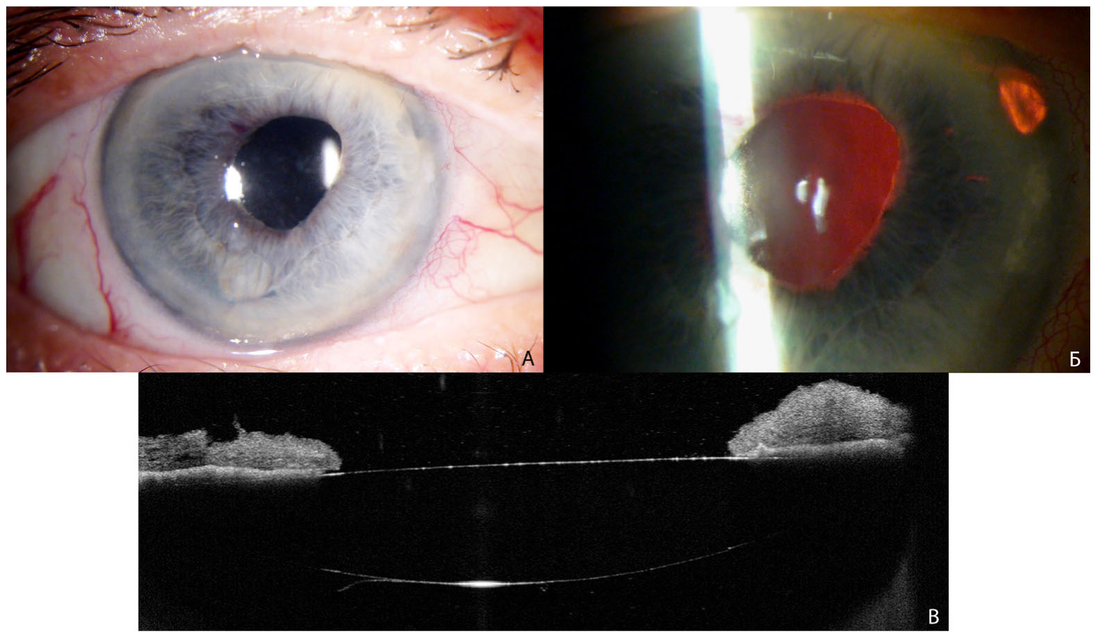 Рис. 5. Третий тип шва: А, Б – фотография переднего отрезка глаза, иллюстрирующая перетянутый шов, деформацию радужки и зрачка, колобому, выполненную с целью профилактики зрачкового блока, В – оптическая когерентная томография витрео-лентикулярного интерфейса, визуализирующая плотное прилегание ИОЛ к радужке