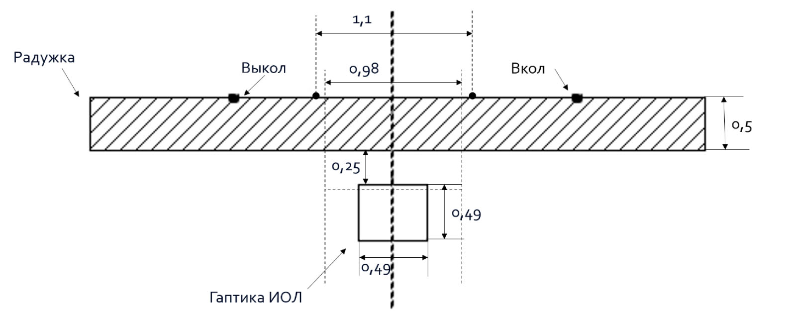Применение ирис-ретракторов обосновано математическим моделированием для расчета оптимального натяжения шовной нити, в котором учитывалась толщина радужки (0,5 мм), параметры поперечного сечения ИОЛ (квадрат со стороной 0,49 мм, модель Tecnis), возможность разнообразия ширины гаптики ИОЛ в зависимости от модели линзы (0,98 мм отрезок равный двум гаптикам), минимально необходимое расстояние от радужки до ИОЛ (0,25 мм), параметры двух ирис-ретракторов (1,1 мм – соответствует ретракторам занимаемым всю ширину парацентеза), вариабельность дистанции вкол/выкол (интервал 1,4–1,8 мм) (рис. 6). Полученные шовные петли после удаления ирис-ретракторов будут надежно фиксировать ТИОЛ в нужном положении, при этом сохраняя пространство «радужка-ТИОЛ», что позволяет исключить деформацию зрачка и не нарушает диафрагмальную функцию радужки, что подтверждается данными послеоперационного ОКТ-исследования (рис. 4В).