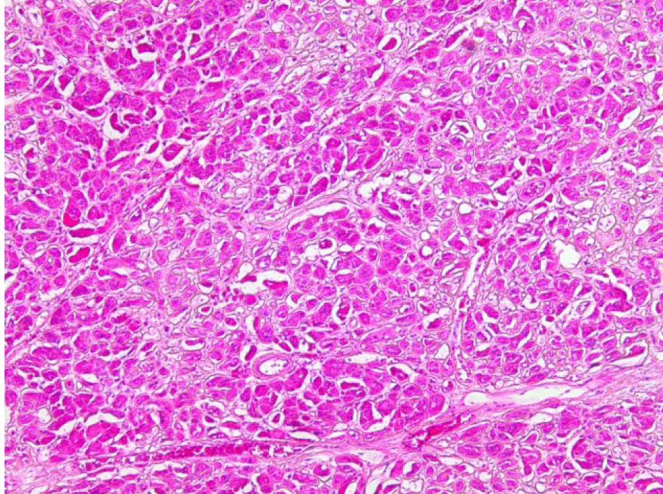 Гистологическое исследование. Сердце – кардиомиоциты гипертрофированы, диффузный кардиосклероз. При окраске на амилоид в строме и стенке сосудов отложение амилоидных масс (рис. 1). Селезенка – красная пульпа полностью замещена однородными массами, дающими положительную окраску на амилоид (рис. 2).