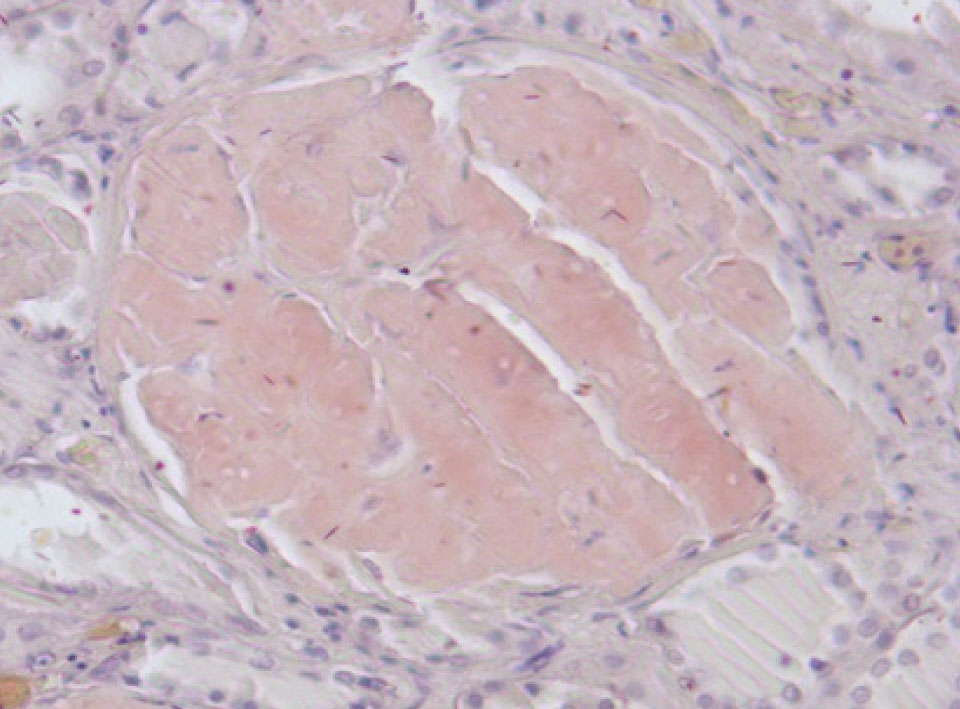 Рис. 3. Почечный клубочек замещен амилоидными массами. Окраска конго красный, ×400