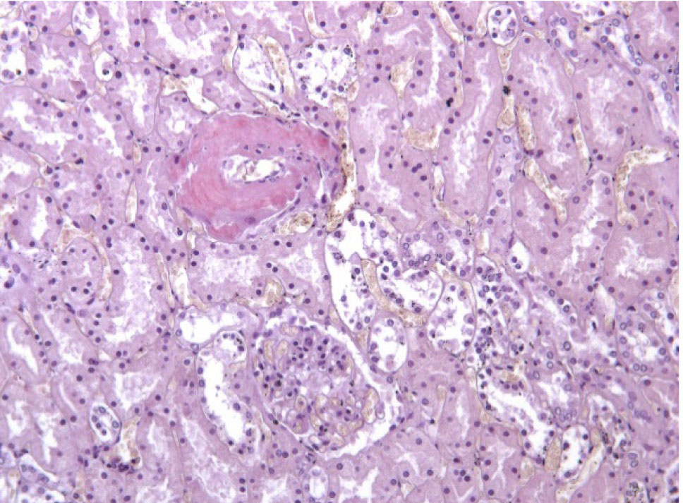 Почки – резкое уменьшение числа клубочков, отдельные полностью замещены однородной массой, дающей положительную реакцию на амилоид (рис. 3). В стенке сосудов также видны отложения амилоида (рис. 4).