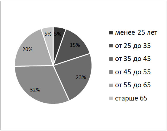 Согласно анкетированию 85,7 % респондентов женщины, большая часть респондентов в возрасте от 35 до 55 лет (55 %) (рис. 1). По критерию основная профессиональная деятельность 33,78 % анкетируемых являлись практикующими врачами, 11,46 % – руководителями в сфере здравоохранения, 54,76 % – это прочие медицинские работники. При учете распределения по уровню МО большая часть респондентов работает на уровне муниципального образования (66,8 %), третья часть (30,1 %) – на региональном, остальные медицинские работники – в организациях федерального уровня (3,1 %). По критерию уровень медицинской помощи, который оказывает организация, подавляющее большинство работает в медицинской организации первого уровня (58,2 %), второго и третьего уровней – 19,5 и 22,3 % соответственно. Анализируя данные респондентов, можно сделать вывод, что 82 % работают больнице (в том числе детской), поликлинике (в том числе детской), специализированной больнице, участковой больнице. Среди респондентов представители 61 специальности: наибольший удельный вес заняли специальности педиатрия 18,30 %, клиническая лабораторная диагностика 10,71 %, лечебное дело 9,08 %, сестринское дело 7,44 %. Из числа опрошенных только 3,57 % имеют специальность «рентгенология», все эти специалисты работают на рентгенографах, некоторые также анализируют маммографию, КТ- и МРТ-изображения. В результате анализа анкет было выявлено, что 4,2 % медицинских работников имеют ученую степень (рис. 2).