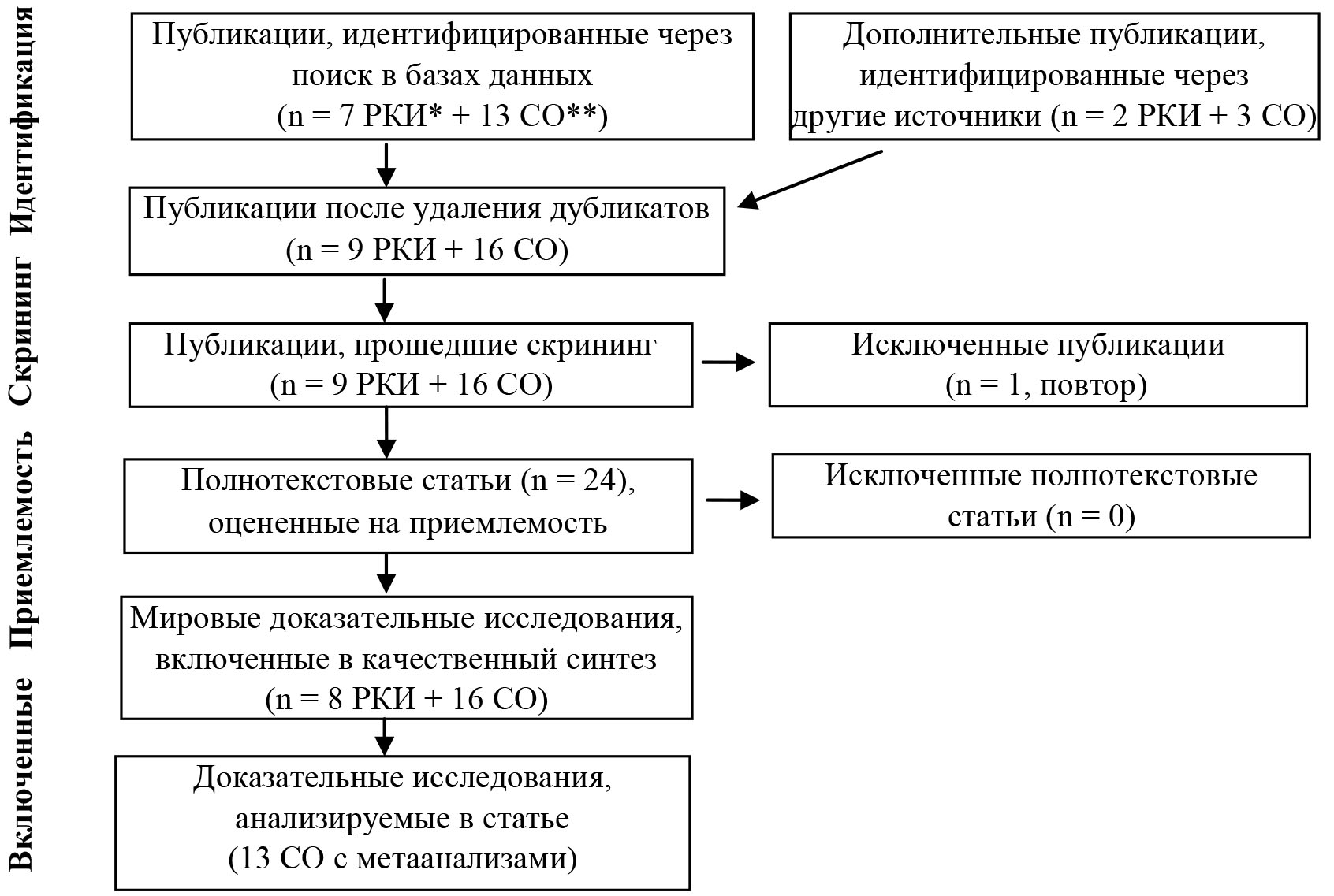 Рис. Блок-схема PRISMA. Условные обозначения: *РКИ – рандомизированные контролируемые исследования, **СО – систематический обзор и метаанализ