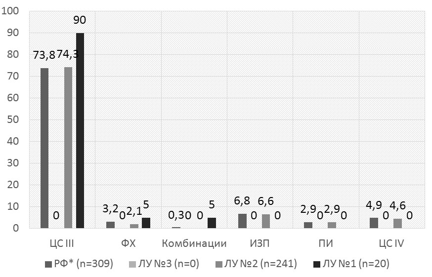 С целью антибиотикопрофилактики в ЛПУ № 2, как и в целом в России, АМП назначались чаще в отделениях хирургического профиля – 99,6 и 92,3 % соответственно. Однако в ЛПУ № 1 частота использования АМП с целью профилактики была выше в терапевтических отделениях и составила 55,6 %. В ЛПУ № 3 назначений АМП для профилактических целей зарегистрировано не было. Препаратами выбора для проведения периоперационной профилактики были ЦС III (рис. 1). При этом длительность данной профилактики в ЛПУ № 1 в 100 % случаев составила больше одного дня. В ЛПУ № 2 периоперационная профилактика длилась больше одного дня в 70 % случаев, в 1 % случаев ее длительность составила один день, а в 29 % это было однократное введение.