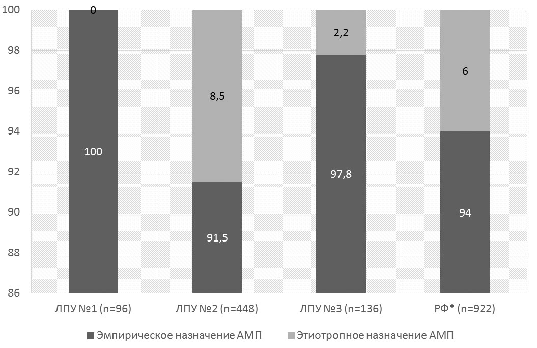 В ходе исследования были собраны данные о этиотропном назначении АМП. Наиболее высокий процент этиотропного назначения АМП был в ЛПУ № 2, он составил 8,5 %. В ЛПУ № 1 все 100 % назначений были эмпирическими. В ЛПУ № 3 этиотропная антимикробная терапия проводилась у 2,2 % пациентов. В России доля этиотропного назначения АМП составила 6 % (рис. 2), при этом доля назначений, основанных на данных микробиологической лаборатории, составил 0 % в ЛПУ № 1, 15,1 % в ЛПУ № 2, 3,3 % в ЛПУ № 3, что в среднем сравнимо с данными по РФ – 7,7 %.