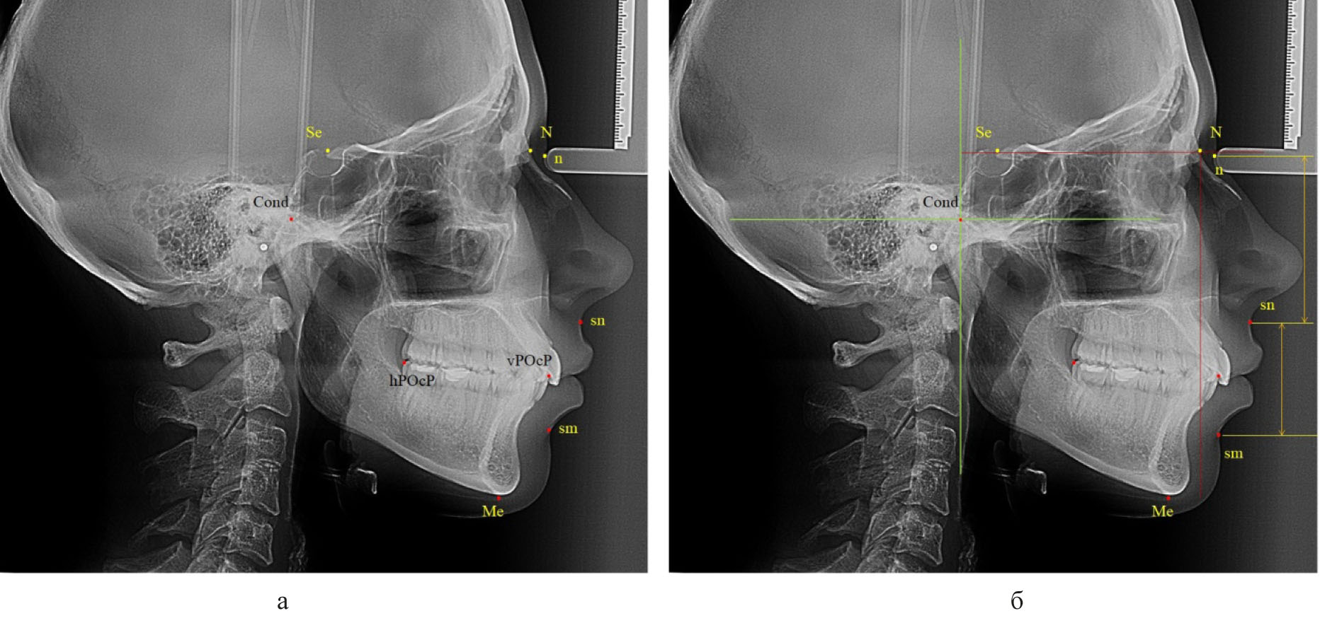 На телерентгенограммах, масштабированных 1 : 1, наносили основные точечные ориентиры. Из многообразия общепринятых в клинической стоматологии точек использовали точки, позволяющие в последующем оценивать вертикальные размеры лицевой области, положение элементов сустава и окклюзионные ориентиры. Для определения положения плоскости основания черепа использовали среднюю точку входа в турецкое седло (Se), которую соединяли с точкой соединения лобной и носовых костей (N), как было рекомендовано A.M. Schwarz (1958). Перпендикулярно к ней из назального костного ориентира опускали линию (прототип вертикали Дрейфуса), которая позволяла определять положение верхней челюсти относительно структур черепа в целом. Кроме этого из костных ориентиров использовали верхнюю точку суставной головки (Cond), заднюю окклюзионную точку (hPOcP), расположенную на дистальном бугорке второго моляра, и переднюю окклюзионную точку (vPOcP) в месте смыкания антагонирующих медиальных резцов. Соединение указанных точек определяло расположение окклюзионной линии (плоскости). Из кожных ориентиров использовали назальную точку (n), субназальный ориентир (sn) и супраментальную кожную точку (sm). Для удобства измерений через указанные кожные точки проводили горизонтальные линии перпендикулярно к вертикали Дрейфуса и измеряли вертикальные размеры лица, в частности «n-sn» и «sn-sm» (рис. 1).