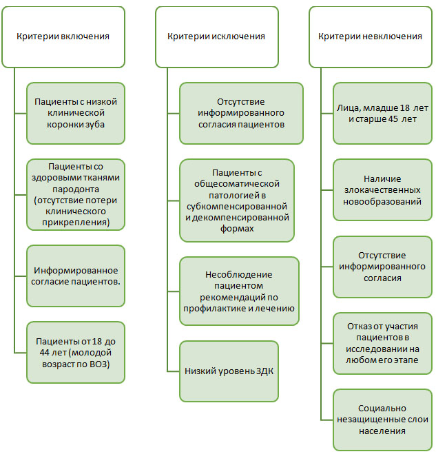 Из 416 обследуемых пациентов 96 (23,1 %) пациентов не вошли в исследование, так как не соответствовали разработанным критериям. Следует отметить, что у 6 (1,4 %) пациентов отмечался низкий уровень зубодесневого комплекса, что также являлось критерием исключения. Таким образом, группы сравнения составила 320 человек, рандомизированных методом «простых конвертов» на 6 подгрупп.